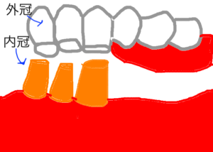 コーヌスデンチャーとは残っている歯に冠のような金属を被せてその上にさらに金属を被せる