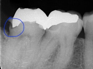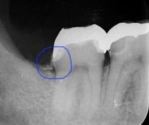 レントゲンの青丸の部分が被せ物の下の虫歯になります。