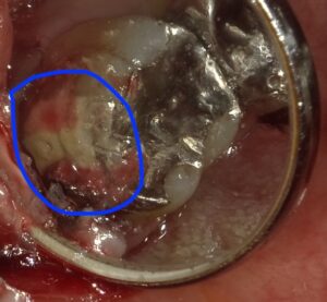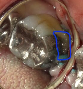 歯肉を切開し開いて青で囲った部分の虫歯を露出させます。