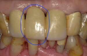 左の画像は真ん中の歯がありませんが右がブリッジをかぶせた画像で青丸部分に