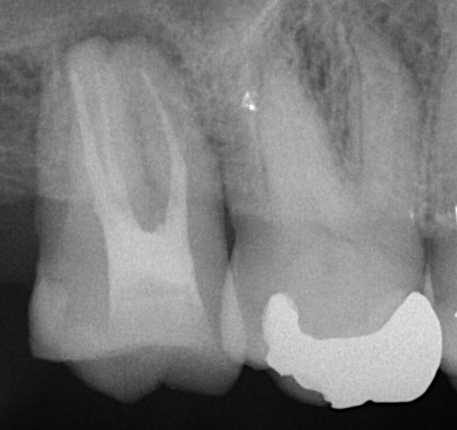 左の歯が根管充填を終えた歯です。3本の棒状の