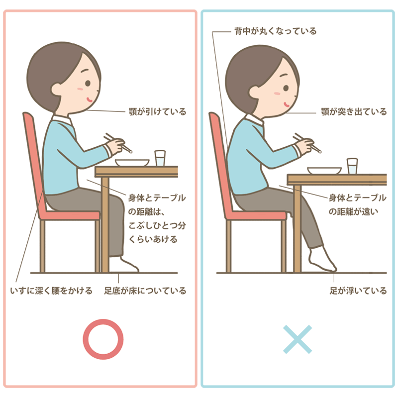 正しい姿勢とはつまり、よく噛めて安全に飲み込める姿勢のことをいいます。正しい姿勢で食事をすることで消化がしやすくなり栄養の吸収もしやすくなります。正しい姿勢で食事をするためのポイントは以下の通りです。