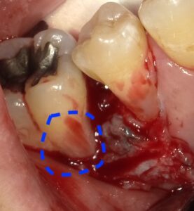 歯茎を開いたところです。青○の部分が虫歯になります。